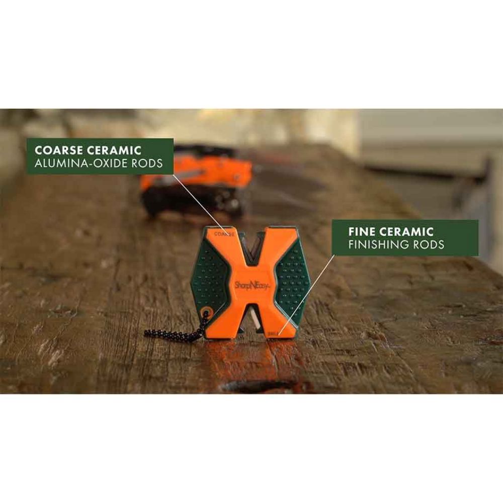 Den medfølgende kompakte AccuSharp sliber holder klingen skarp med få strøg, uanset hvor du befinder dig. Sammen udgør de et funktionelt og slidstærkt sæt til enhver tur i naturen.