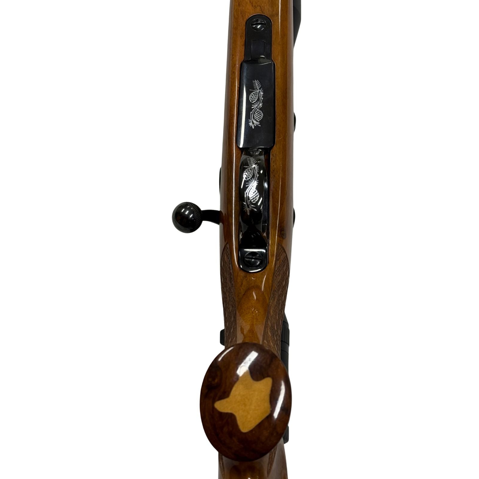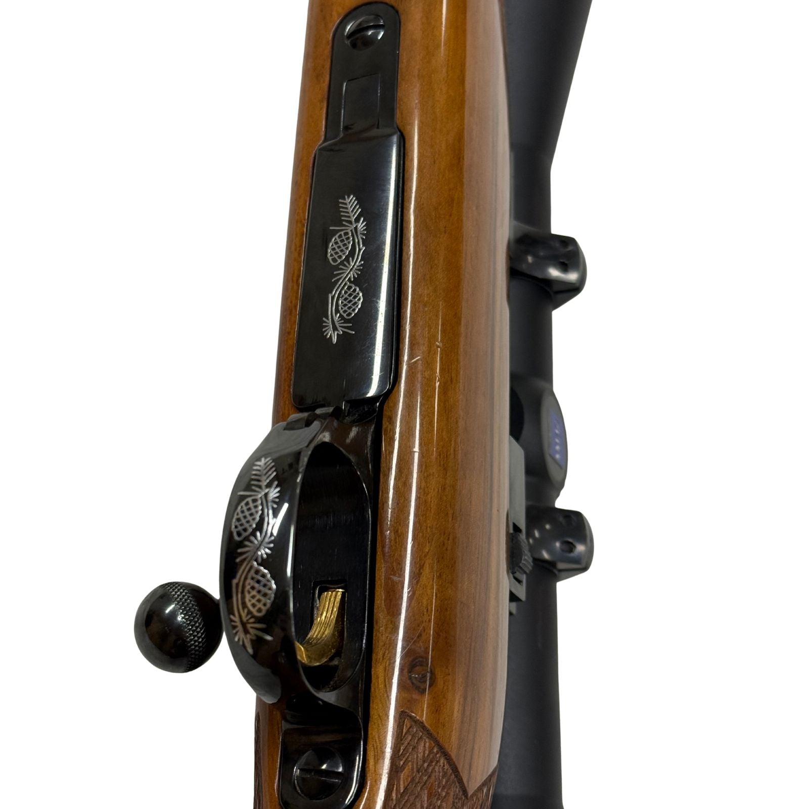 Riflen er en rigtig lux udgave med guld aftræk og sikring, samt udsmykket med graveringer på magasinhængsel og aftrækkerbøjle.