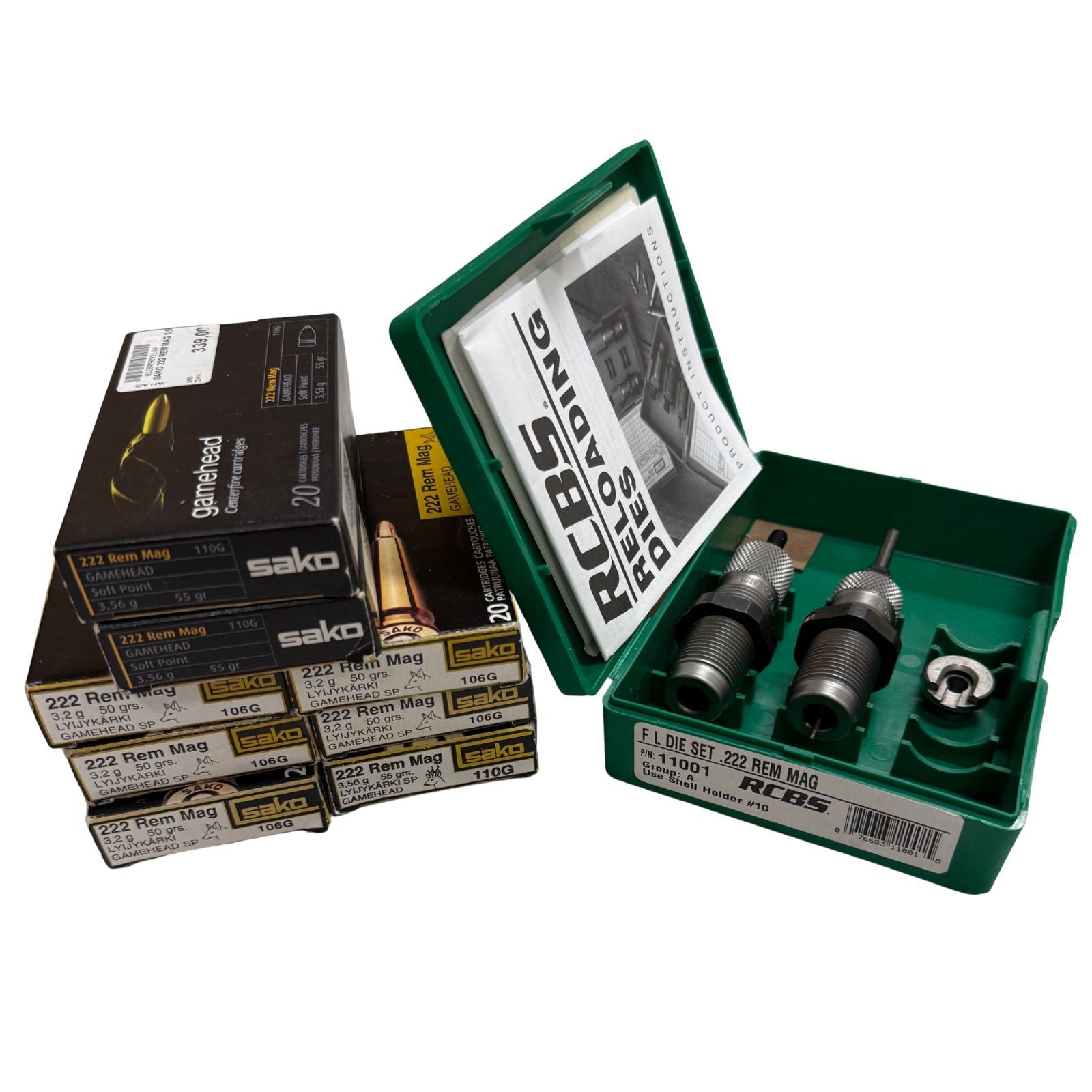 Riflen kommer med ca 8 kasser patroner (en er ikke helt fuld) og et RCBS die set.