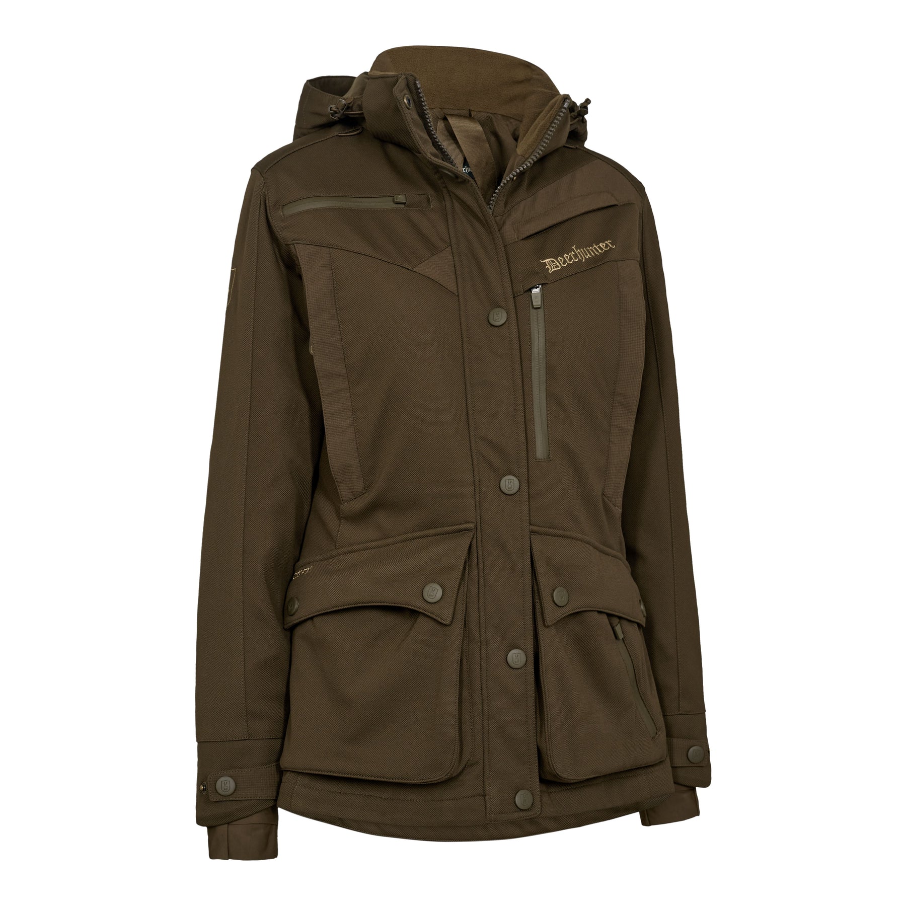 Deerhunter - Lady Muflon Pro Jakke - egenskaber:Aftagelig hætte.2-vejslynlås foran.Radiolomme med skjult lynlås.Radiolomme med vandtæt lynlås.Elastisk strop til antenne.Brystlomme med vandtæt lynlås.Aftagelig pudseklud i brystlommen.To håndvarmerlommer med skjult lynlås.To rummelige forlommer med lommeklap.Ekstra lynlåslomme ved venstre forlomme.2-vejs lynlås i sidesømmen for bedre komfort og ventilation.Formsyede albuer med forstærkning.Vindfang med adgang til dit ur.Justerbar i ærmekanten med trykknap.Harelomme med skjult lynlås i begge sider.To indvendige lommer med skjult lynlås.Justerbar talje med snøre.Rygsækstropper inde i jakken.Logo foring.