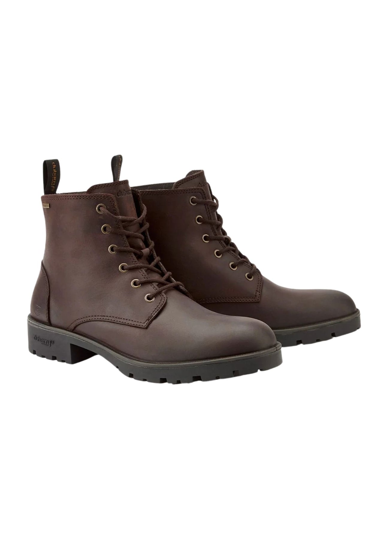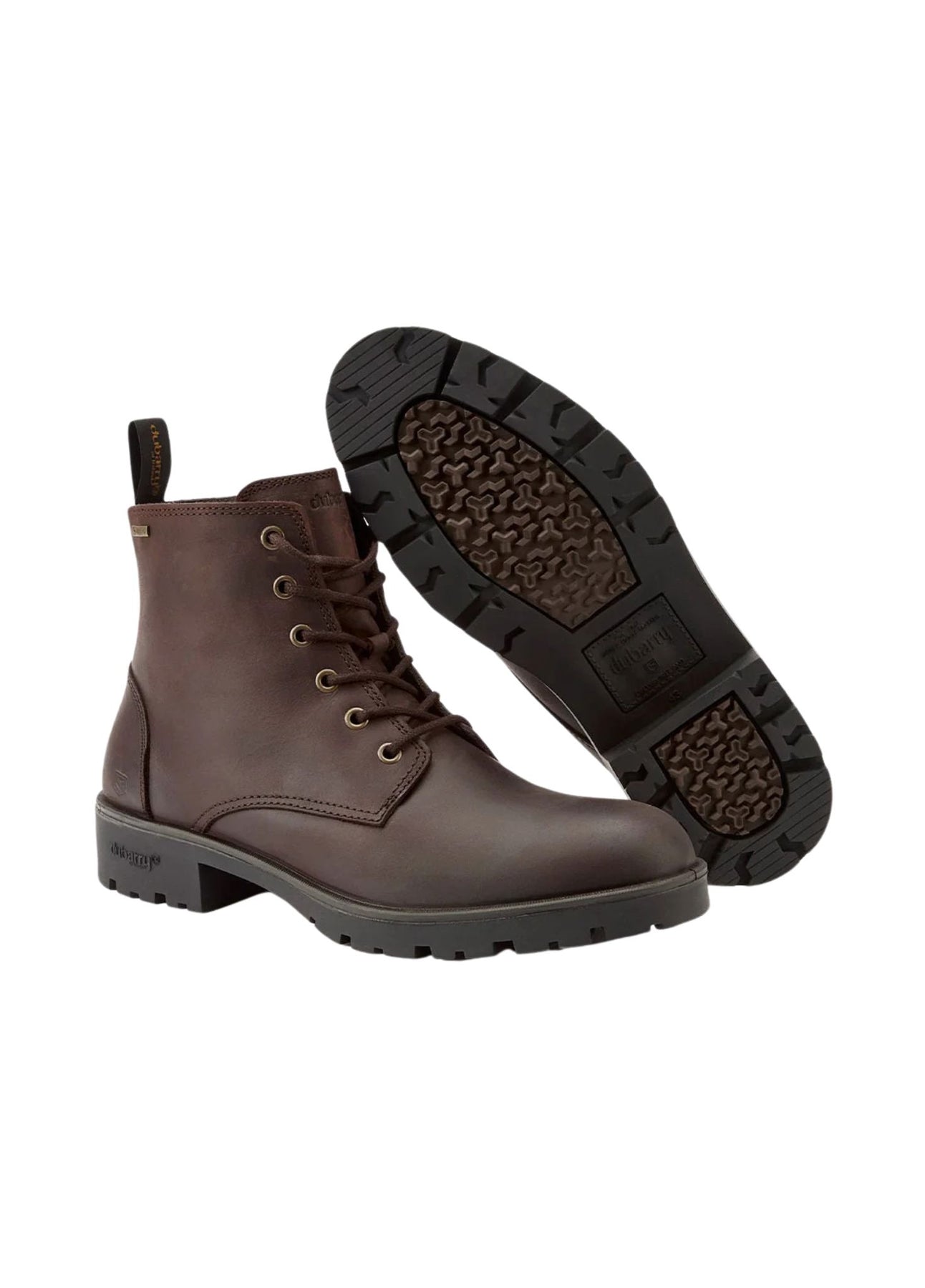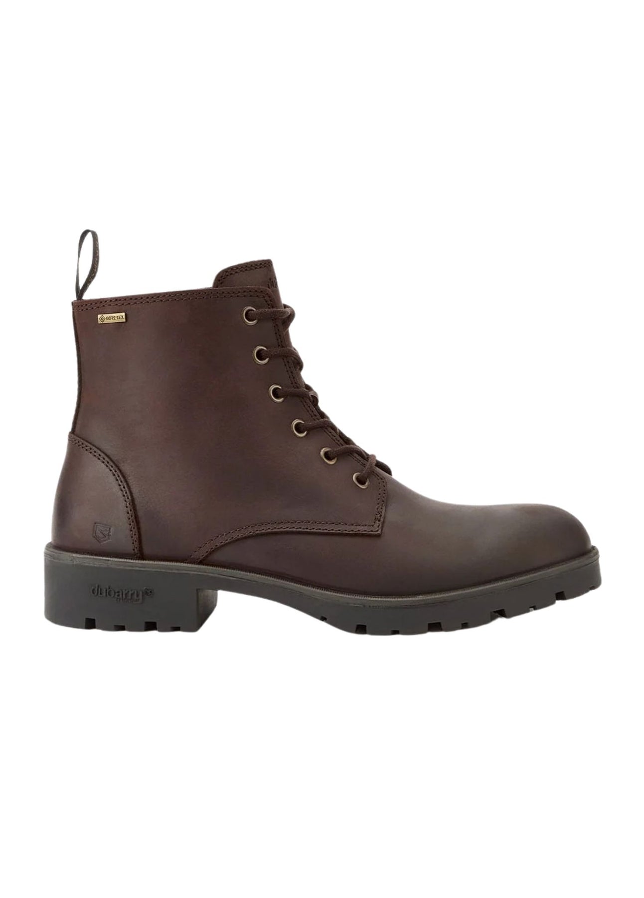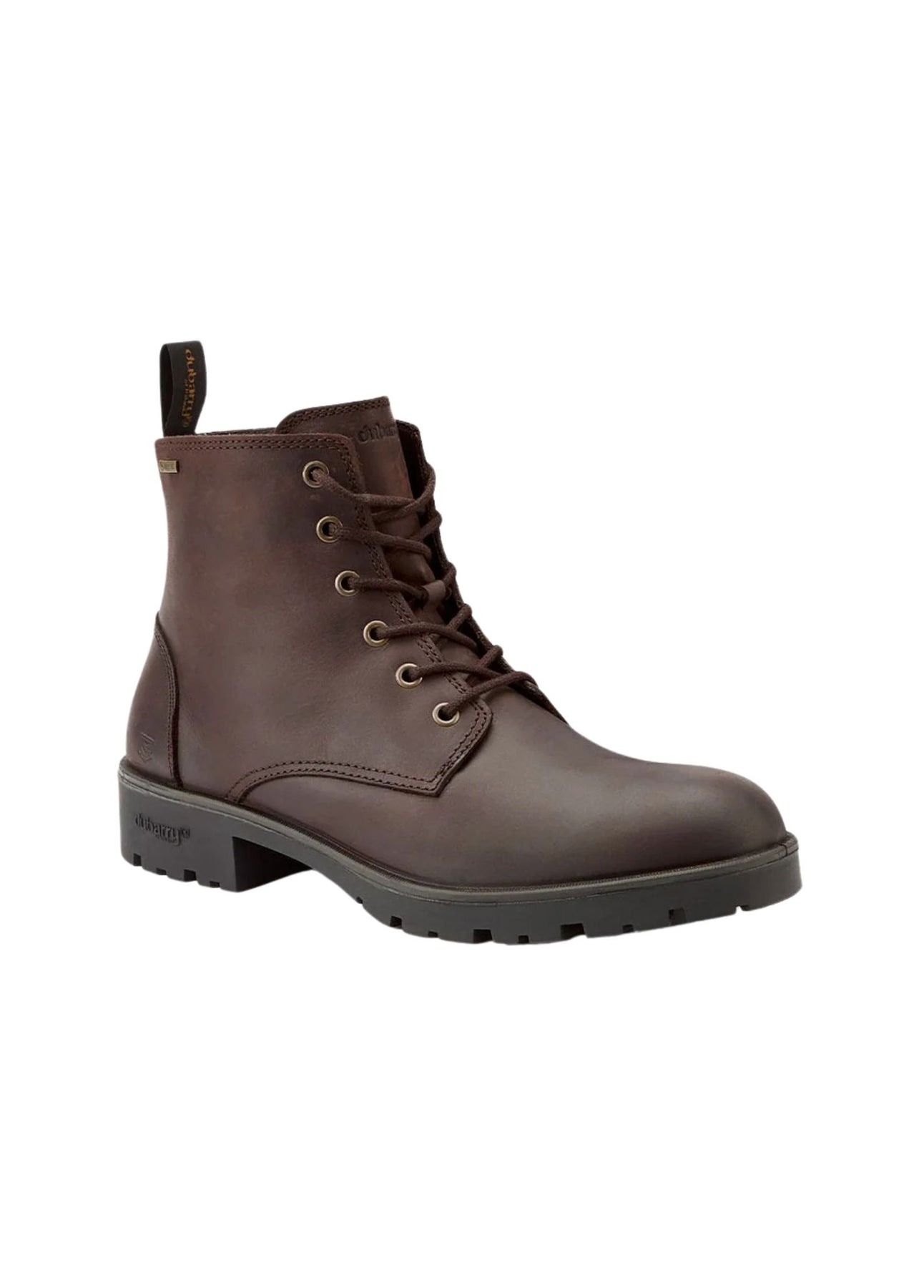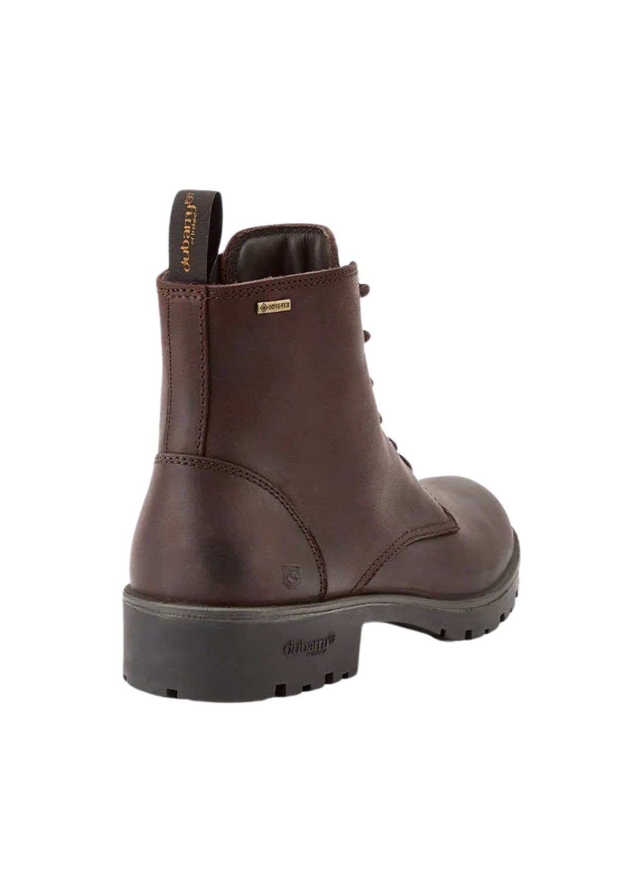 Seks snørehuller med solide stoffsnører giver sikker pasform. Bagpå findes finger-pull til nem af- og påtagning. Dubarry og GORE-TEX branding er indarbejdet diskret, og støvlen har information om stilnavn, nummer og oprindelsesland præget som en permanent detalje. -