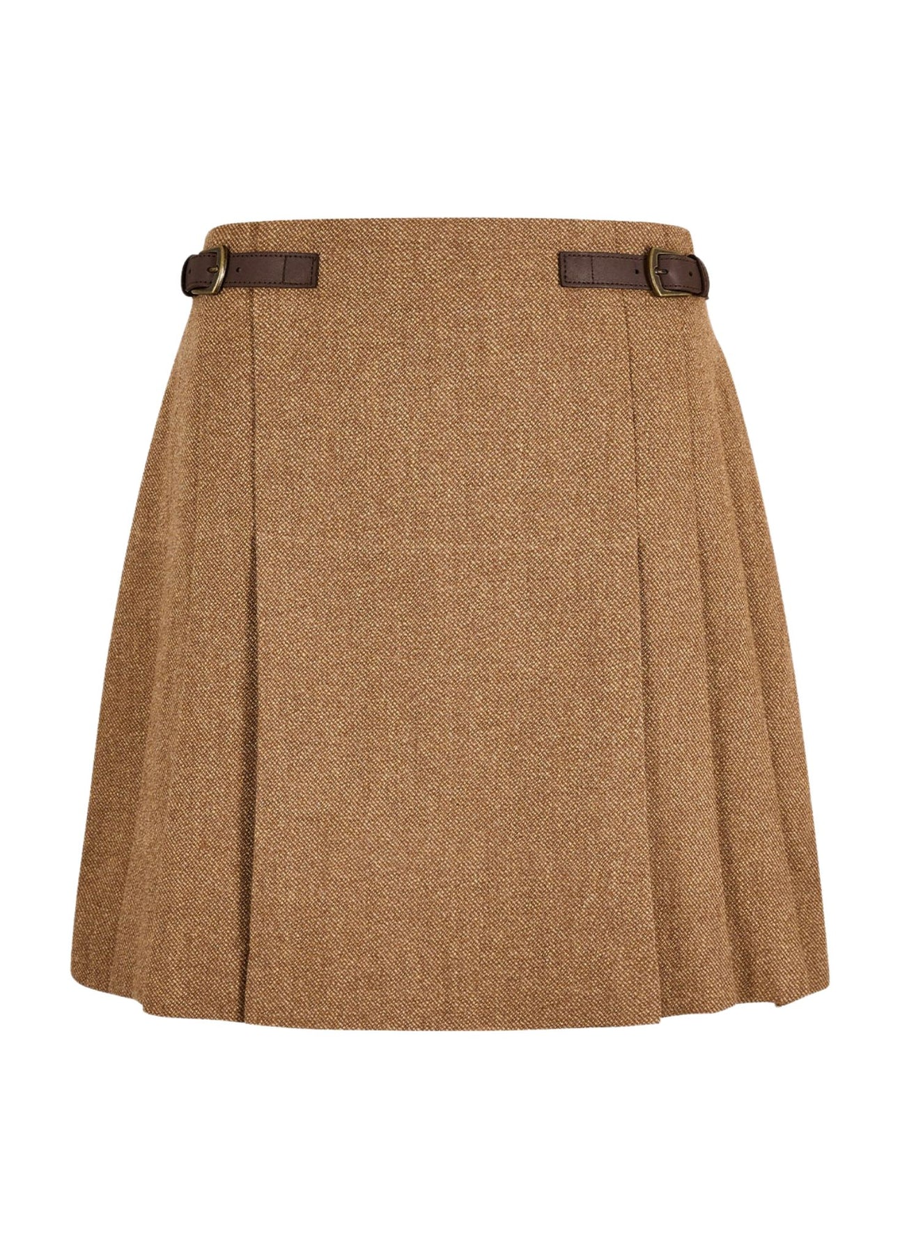 Et klassisk plisseret tweedskørt i luksuriøst Camel Twill, perfekt til både hverdagsbrug og særlige lejligheder.