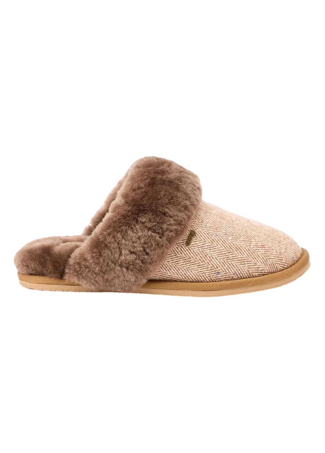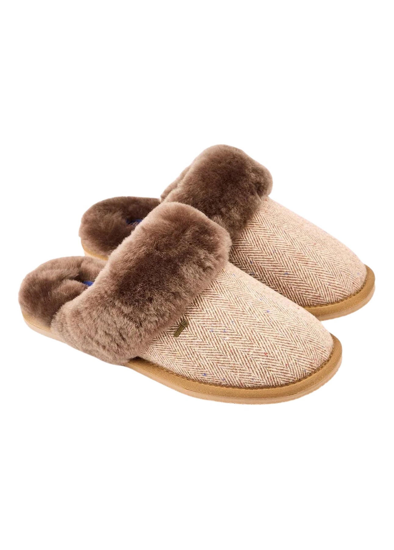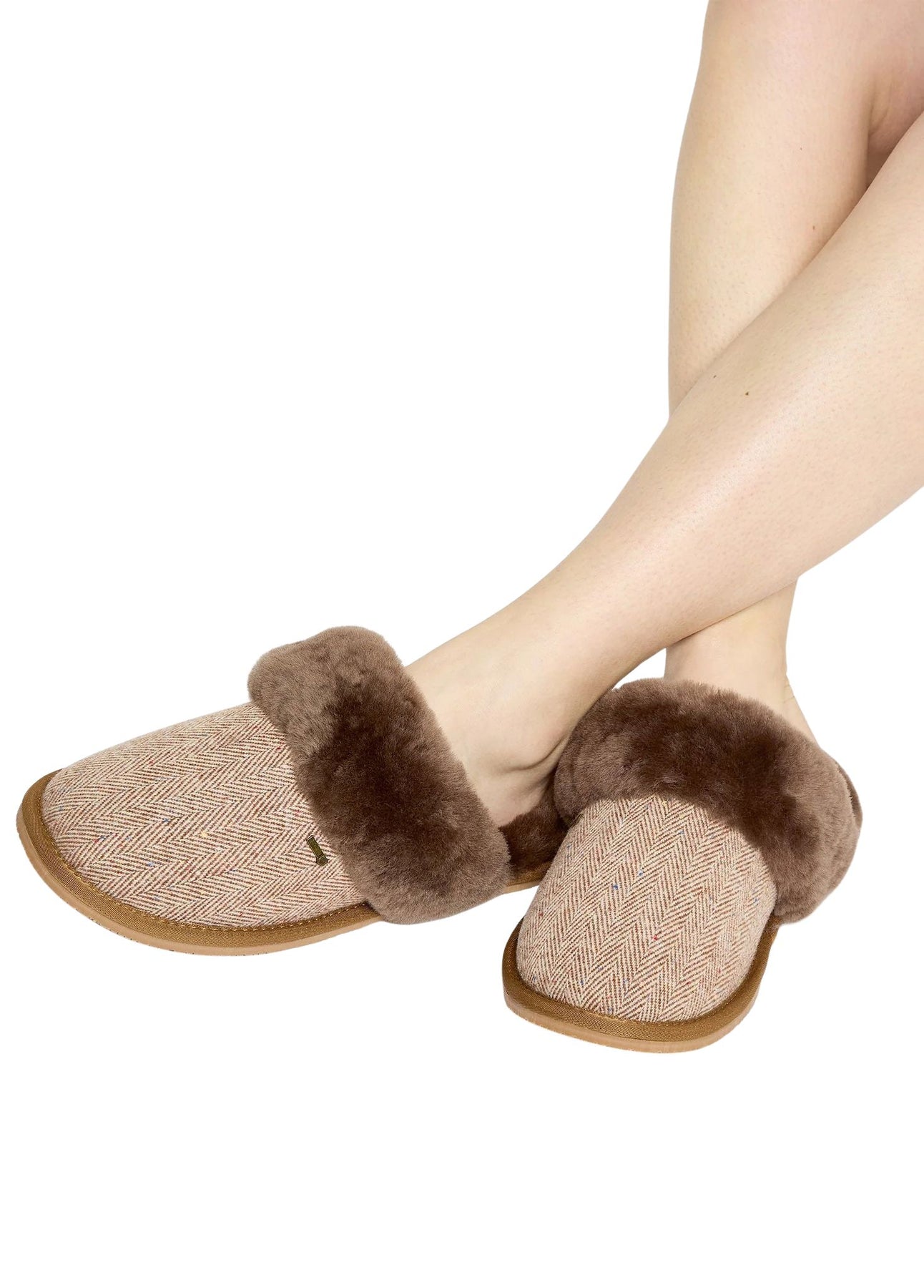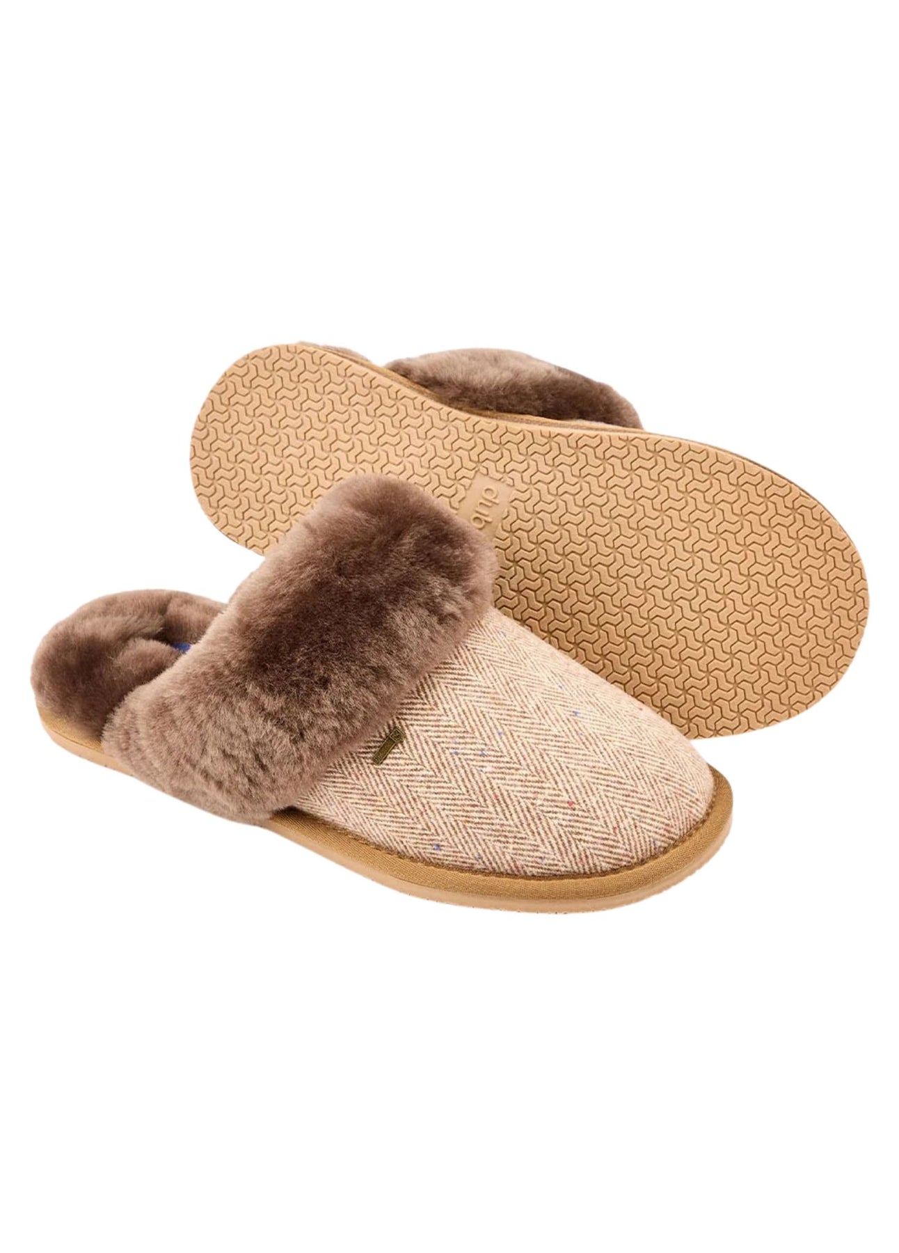 Mullingar Women’s Mule Slippers – Camel Disse mule-slippers forener komfort og luksus i et elegant design – perfekte til at slappe af derhjemme efter en dag udendørs eller som varme selskabsfølger på kolde morgener. Materiale & finishOverdel i tweed med blød shearling-imitationskant samt indvendigt foret med ægte shearling, der omslutter fødderne med varme og velvære. . Såle & stabilitetSkridsikker gummiydersål giver tryghed under fødderne, selv når gulvet er glat eller har ujævne overflader. . Design & anvendelighedSlip-on/mule-stil gør dem nemme at tage af og på — ideelle til alle de dage, hvor komfort er nøgleordet. . KomfortfaktorDe indre pelslag sikrer, at selv de koldeste tæer holdes varme uden at gå på kompromis med åndbarhed. .