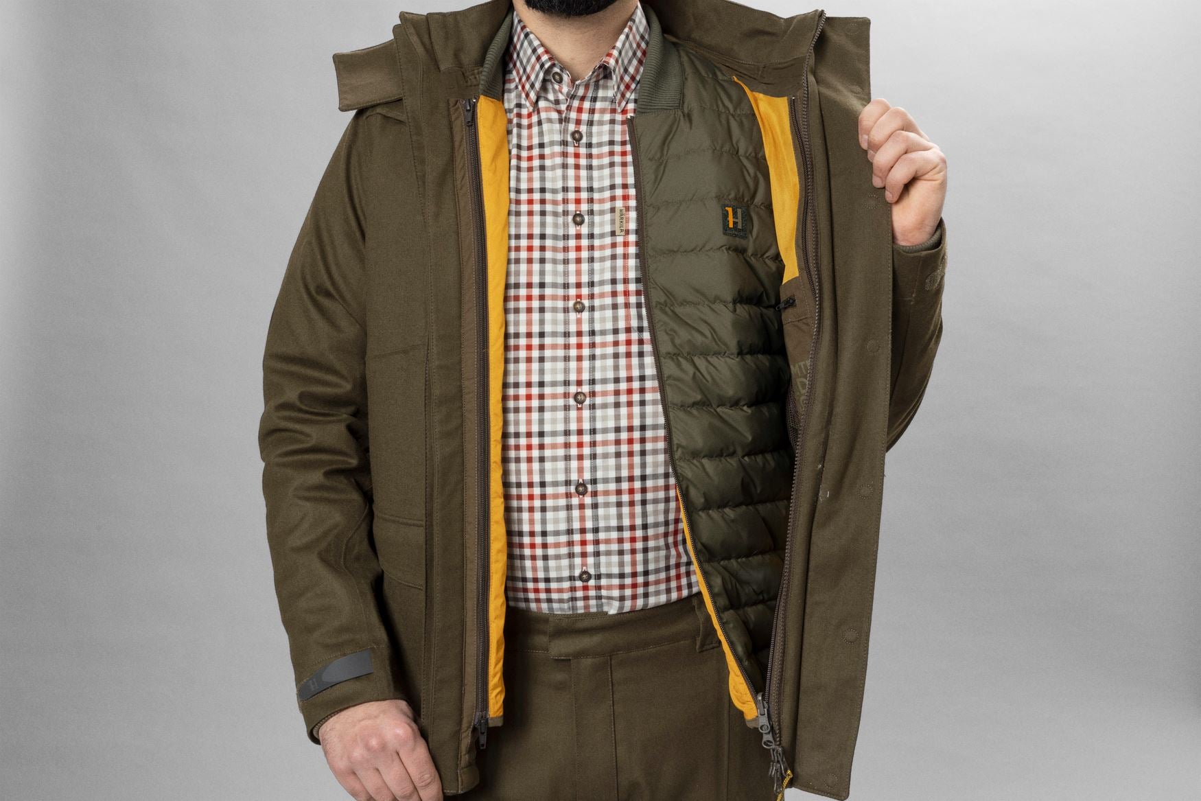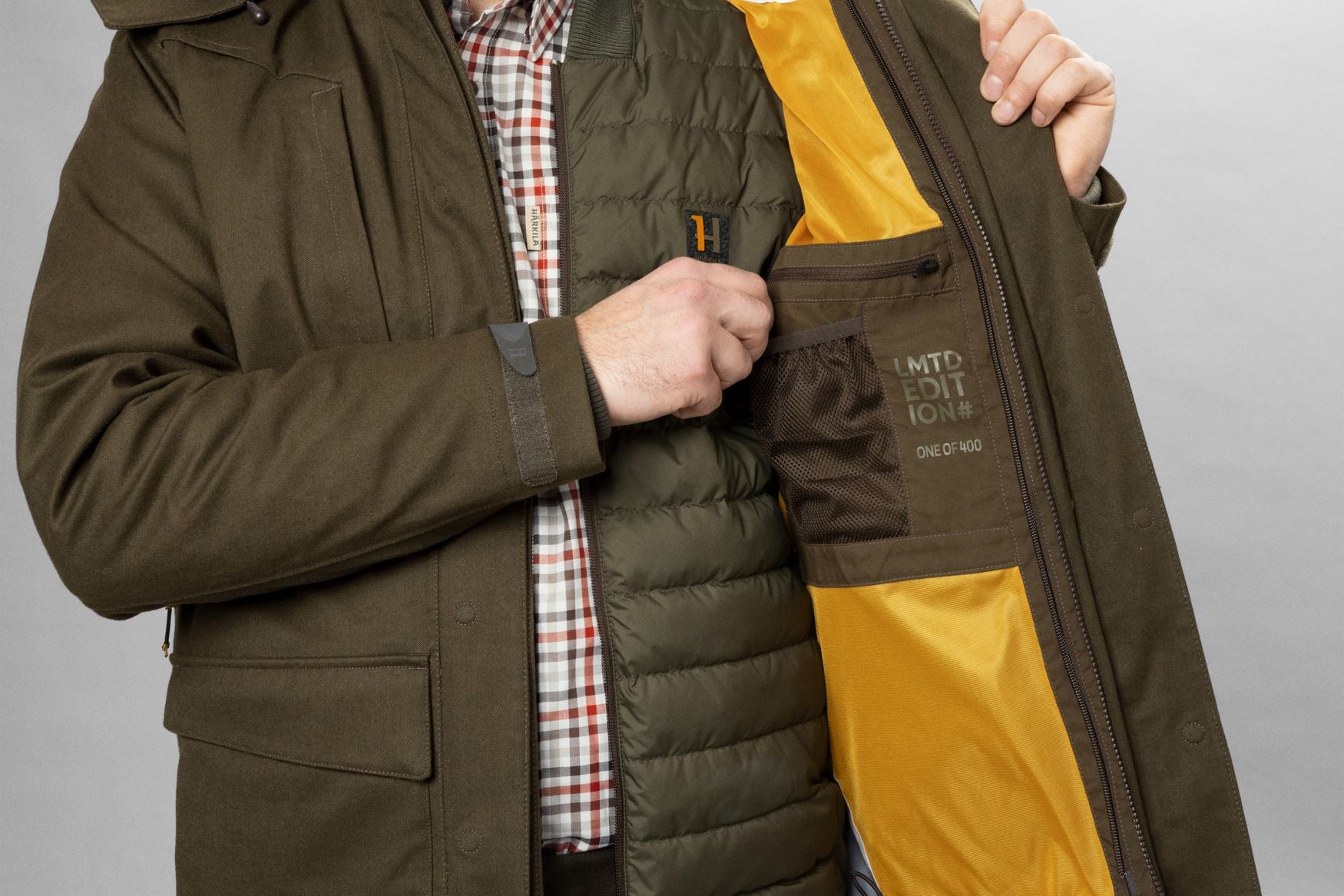Härkila One Ultimate-jakken er det nye benchmark for jagtjakker. Härkila One Ultimate er en jakke i begrænset oplag, da vi kun producerer 400 enheder - når de er udsolgt, bliver der ikke produceret flere jakker. Den har alle de funktioner, du forventer af en high-end jagtjakke, og er udstyret med en Schoeller c_change-membran, der åbner og lukker alt efter vejr og klima. Denne effekt er inspireret af fyrrekogler, som er kendt for at åbne sig, hvis det er tørt, og lukke sig, hvis det er vådt. Dette efterlignes ved, at membranen åbner sine celler og giver mulighed for høj åndbarhed i nogle scenarier, og at cellerne trækker sig sammen, når vejret bliver værre. Jakken er lavet i en 2-i-1-konfiguration, hvilket betyder, at den har en aftagelig inderjakke.