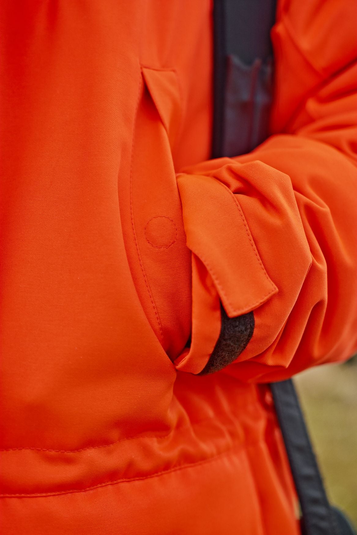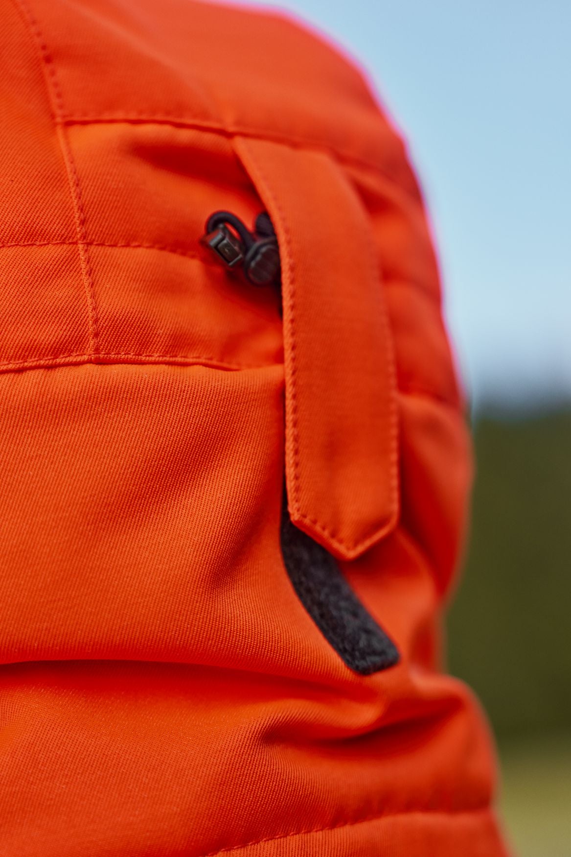 Alle lommer er designet med et formål; venstre brystlomme med lodret lynlås til radio, håndvarmerlommer med gummibelagte, lydløse lukninger og rummelige frontlommer med magnetisk lukning og patronholder i højre lomme. Den aftagelige hætte er justerbar, udstyret med elastiske snore og kan tilpasses efter behov.