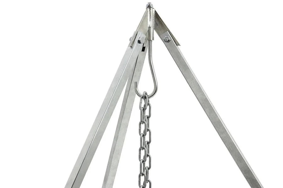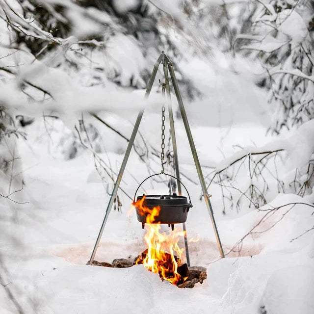 Med Petromax trefoden kan du nemt og effektivt optimere dit udekøkken. Den robuste trefods krog gør det let at hænge en grillrist eller Petromax bålgryde op. Den justerbare kæde giver dig mulighed for at ændre afstanden mellem gryden eller kedlen og ilden når som helst. De skrå fødder sikrer et stabilt fodfæste på forskellige overflader, og hvert ben kan justeres individuelt i højden, så ujævnt terræn nemt udlignes.