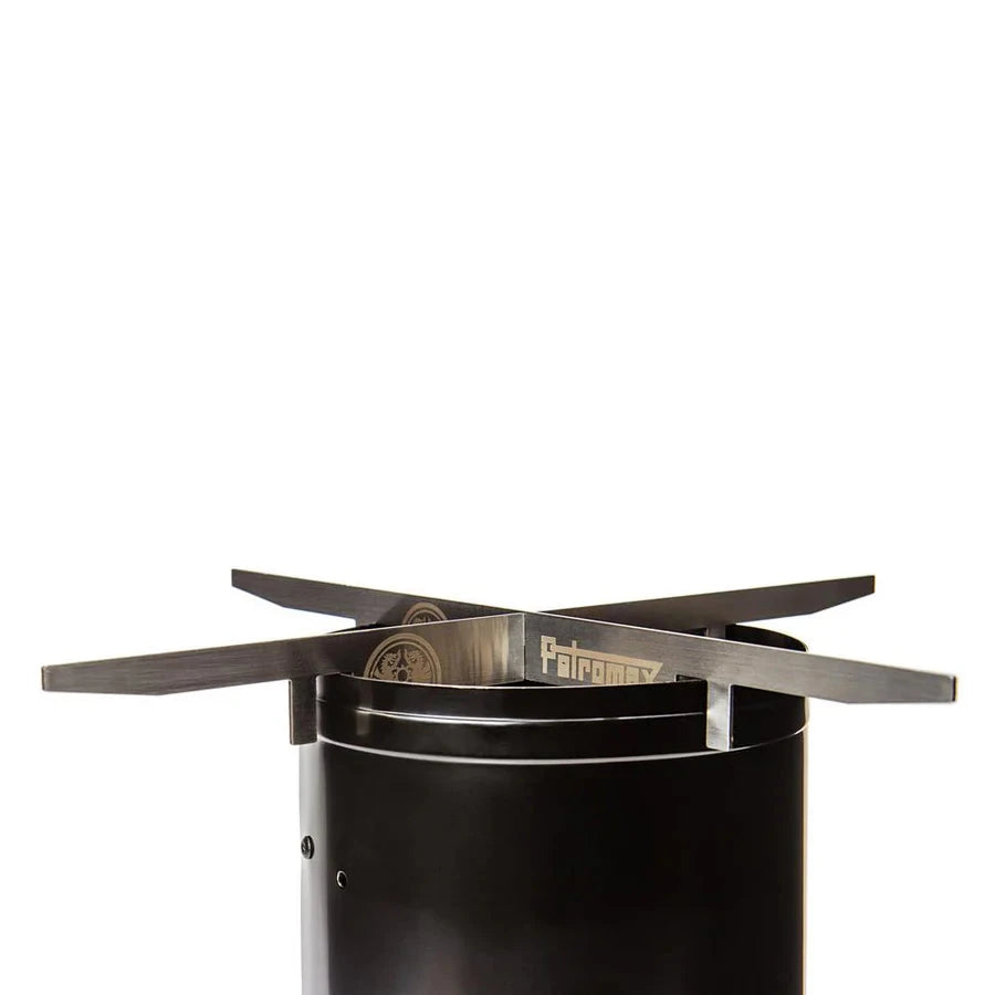Derudover kan ildstativet også bruges som en praktisk bordskåner. Krydsstativet passer til grillstartere og optændingskaminer med en diameter på 14,5 cm til 16,5 cm samt 19 cm til 25 cm. Efter samling fastgøres ildstativet nemt på optændingskaminen gennem de forudskårne åbninger, hvilket hurtigt skaber en effektiv varmekilde til både forberedelse og stegning – eller en praktisk opbevaringsflade.