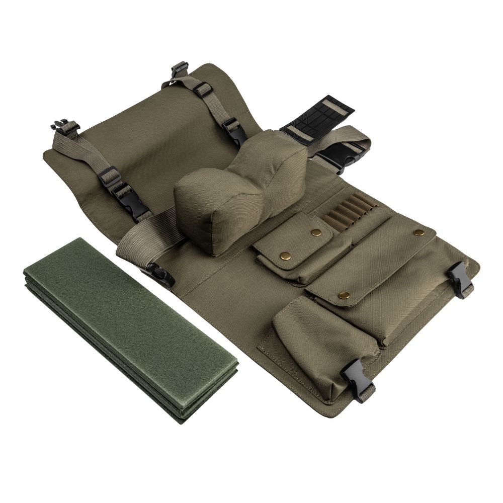 Alsidig jagttaske med integreret skydemåtte, ammunitionholder og praktiske lommer – perfekt til skydebanen eller jagt i felten.