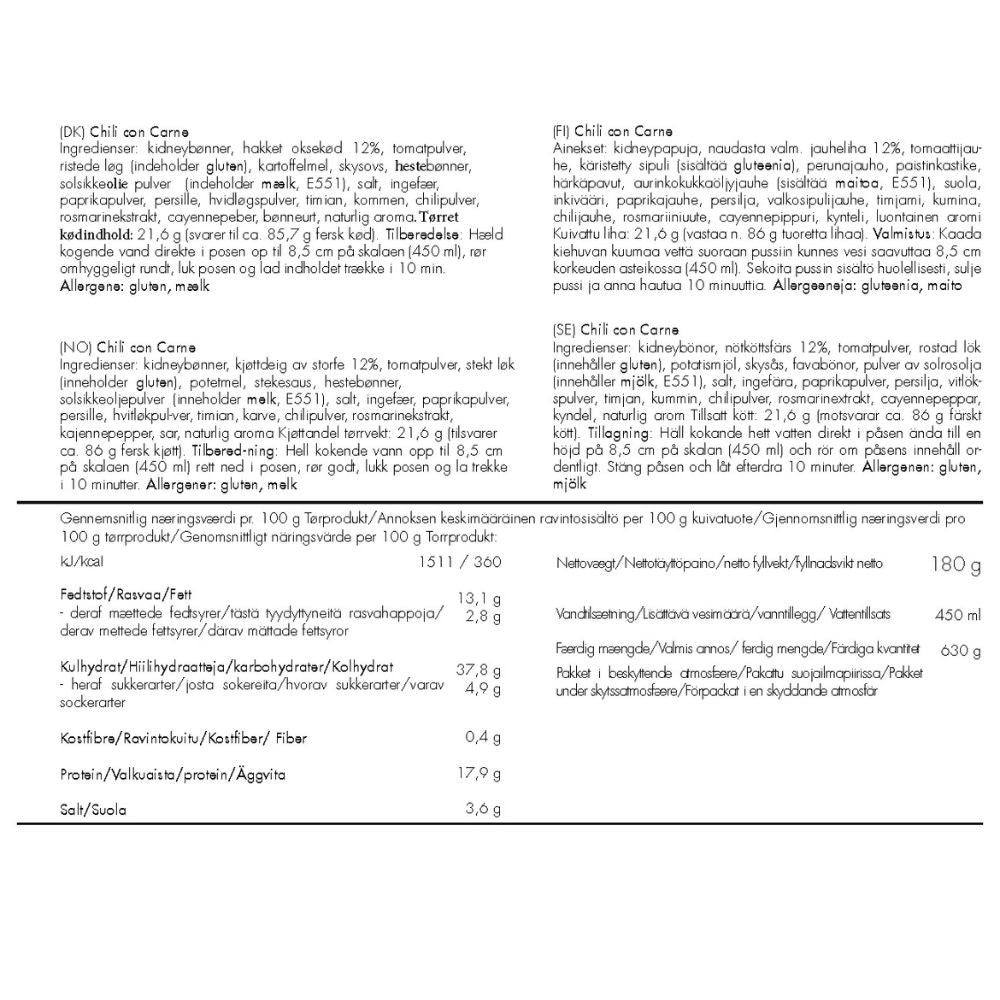 Denne lækre og frysetørrede Chili con Carne byder på smagfuldt oksekød, bønner og krydderier i en varm og fyldig ret – ideel til lange dage i naturen eller når du har brug for et hurtigt, nærende måltid. Nem at tilberede direkte i posen – tilsæt blot varmt vand, vent lidt, og du har et komplet måltid klar på ingen tid.